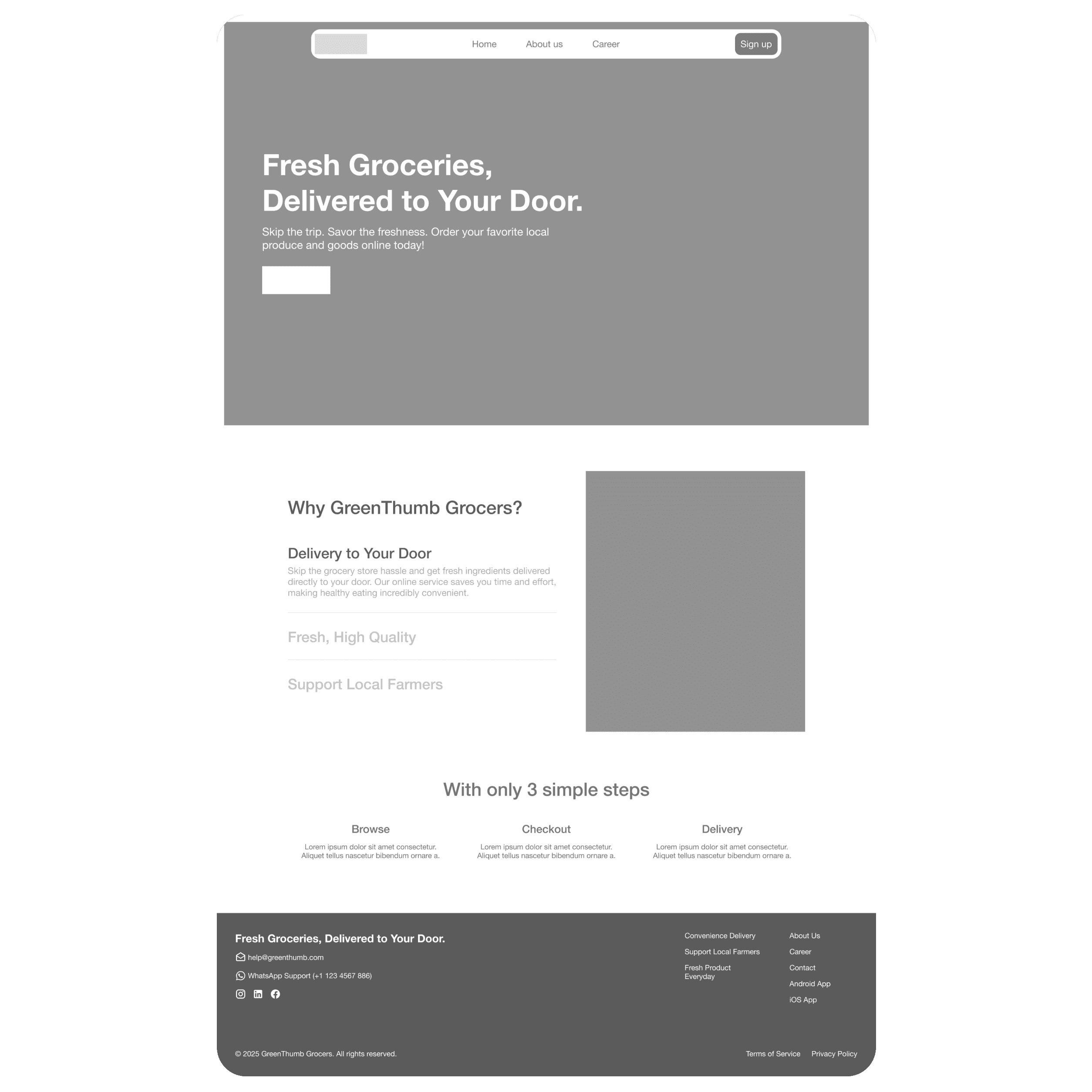 My primary goal for this wireframe was to maximize the information users could grasp at a glance, ensuring a clear and immediate understanding of GreenThumb's value. I started with a compelling hero headline: "Fresh Groceries, Delivered to Your Door." This instantly communicates the core promise: fresh products, conveniently brought to their home. An immediate Call-to-Action (CTA) then guides users directly into the shopping experience.